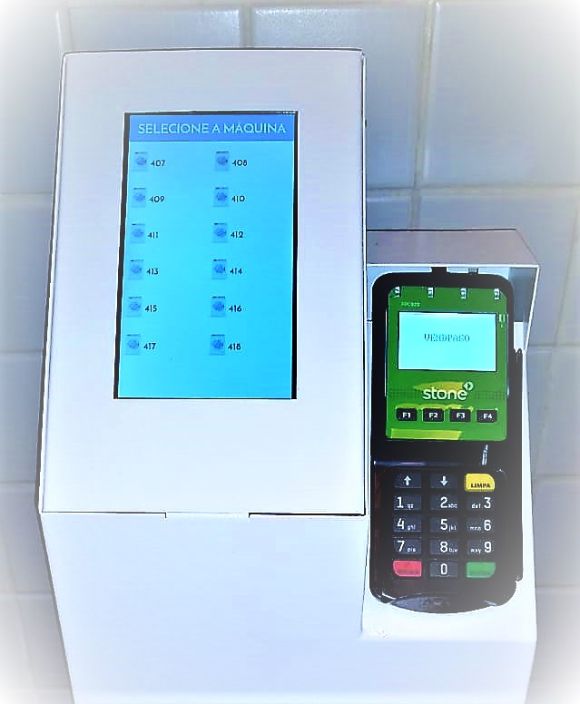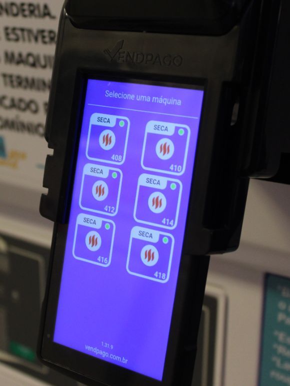 O próprio cliente utiliza a maquininha, que conecta o terminal de pagamento às máquinas de lavar e secar, tendo como opções de pagamento: Crédito, Débito ou PIX.